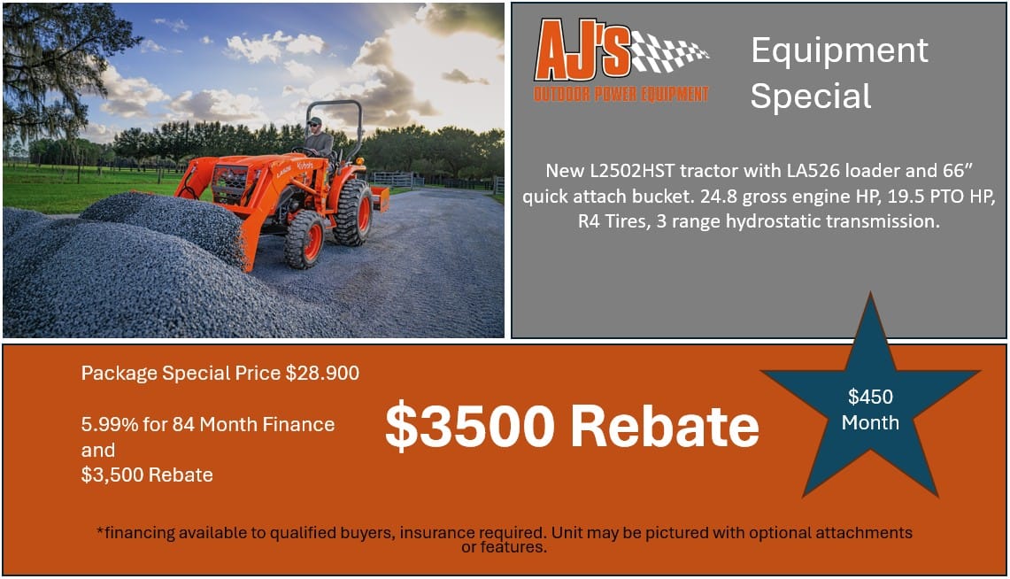 New L2502HST tractor with LA526 loader and 66″ quick attach bucket. 24.8 gross engine HP, 19.5 PTO HP, R4 Tires, 3 range hydrostatic transmission.