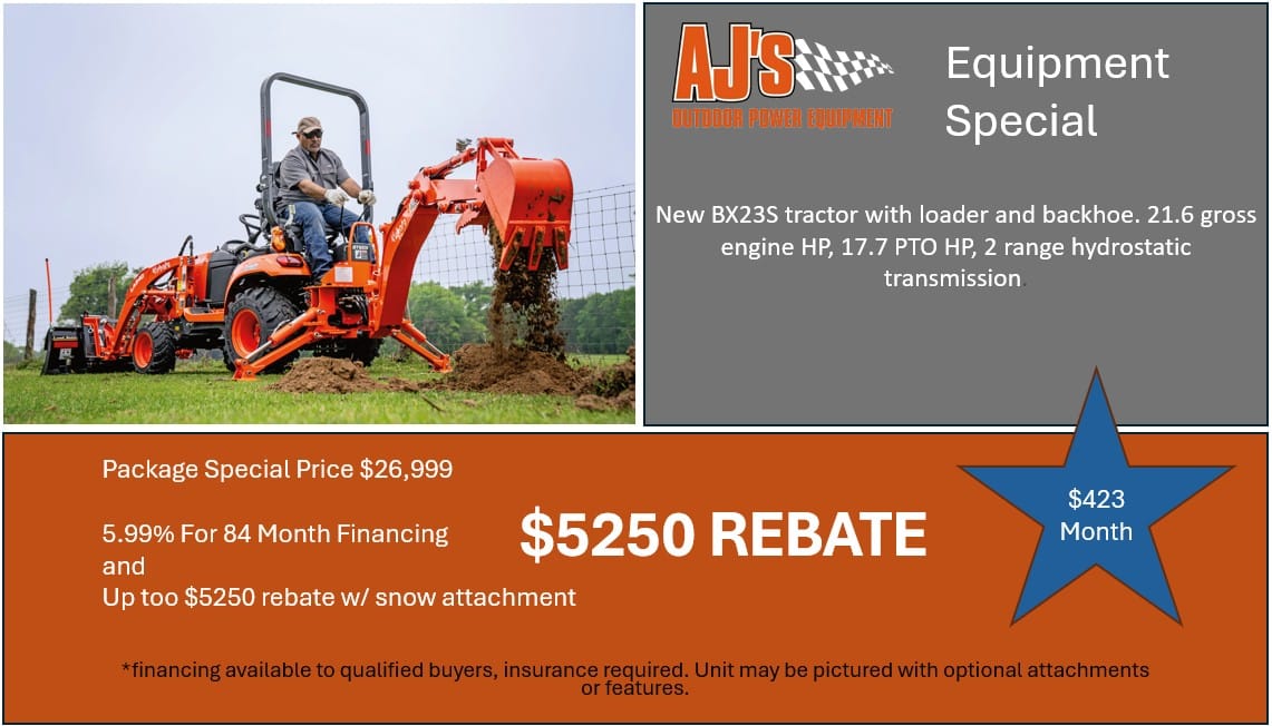 New BX23S Tractor with loader and backhoe. 21.6 gross engine HP, 17.7 PTO HP, 2 range hydrostatic transmission. Package Special priced at$26,999 before tax, ucc fee, doc fee, optional KTAC insurance.